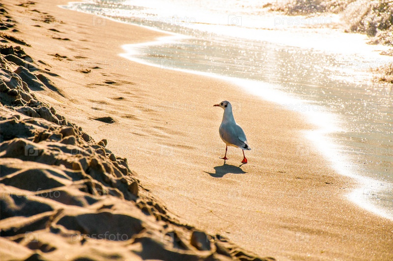 Песчаный желтый пляж на фоне моря, чайки гуляют по песку