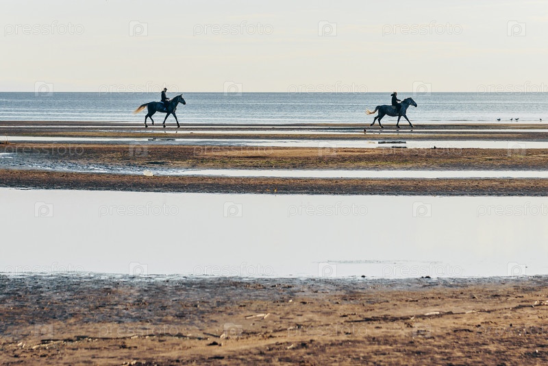 Двое всадников едут на лошадях по пляжу вдоль моря
