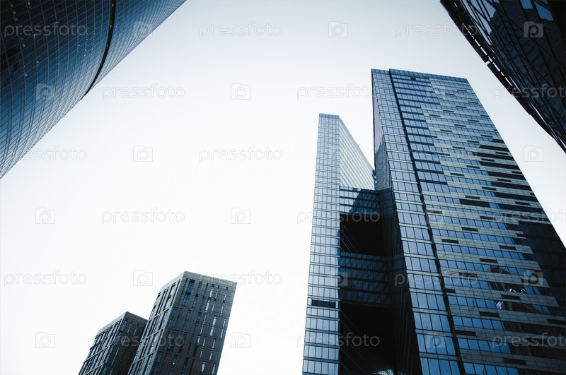 Стеклянные высокие голубые небоскребы в центре большого города, здания на фоне облачного дневного неба