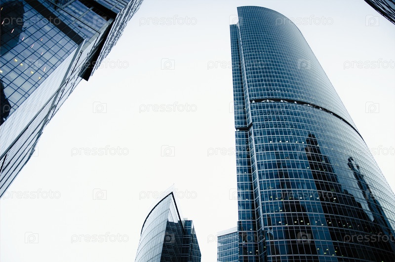 Стеклянные высокие голубые небоскребы в центре большого города, здания на фоне облачного дневного неба