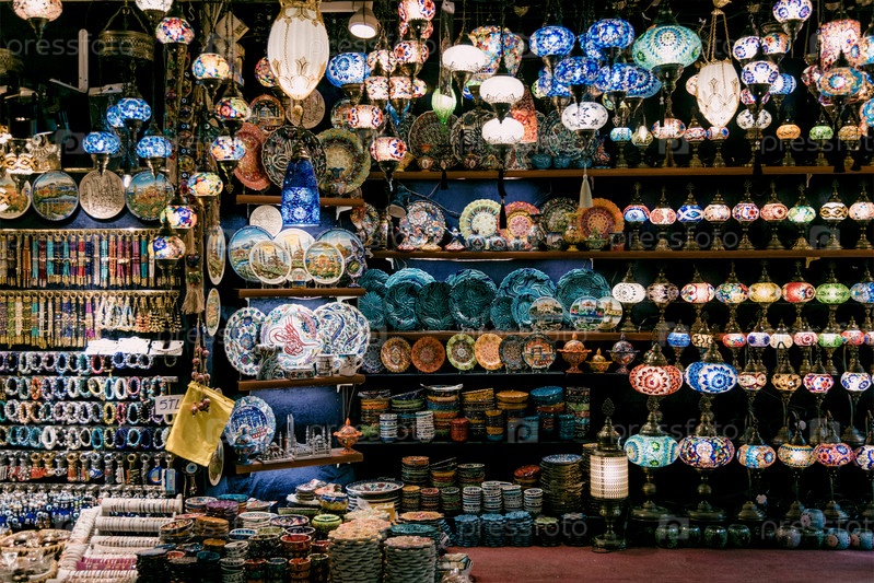 На восточном рынке продаются местные традиционные блюда, тарелки и горох прямо на прилавке магазина