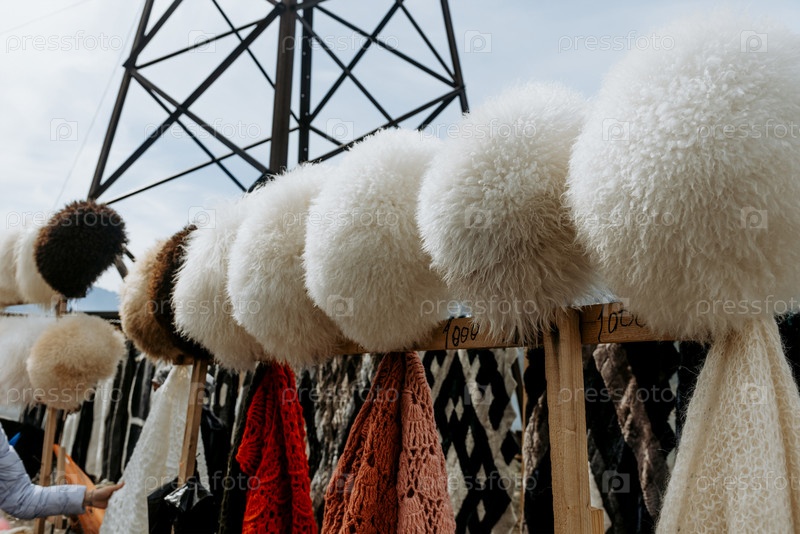 На восточном рынке продают местную традиционную одежду и ткани на полках магазина