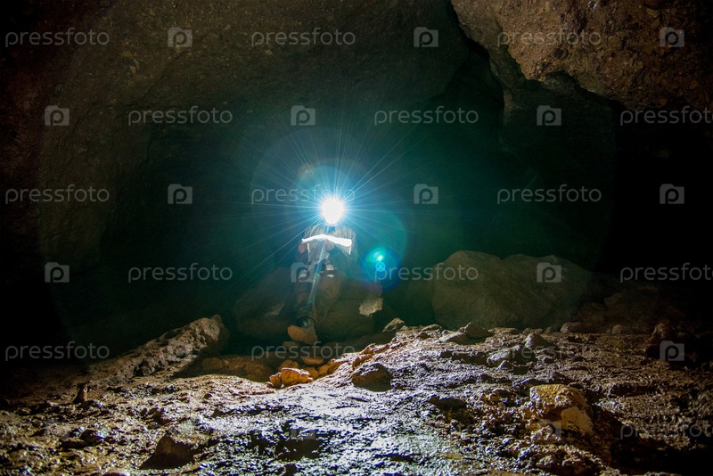 Спелеолог исследует подземную пещеру, геолог изучает гору в отверстии