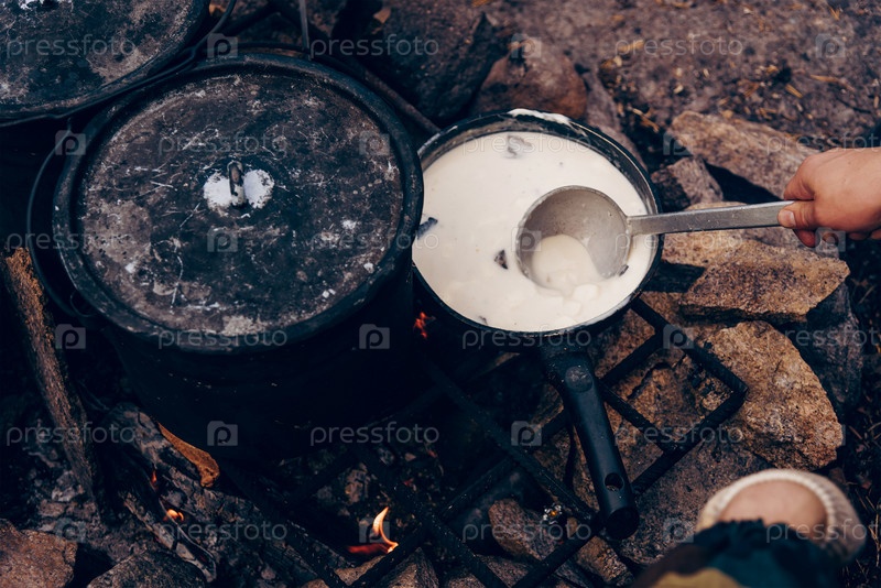Кемпинговая кухня, путешественники готовят еду в котелках на костре