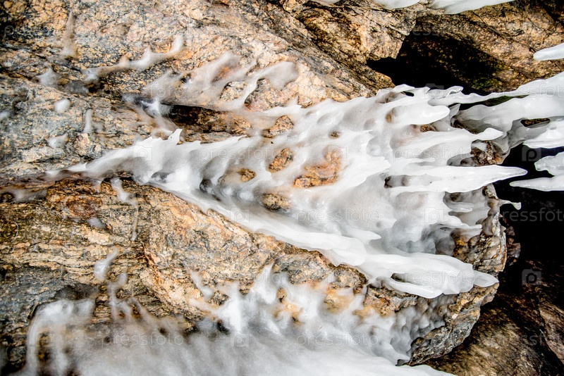 Ледяные сосульки, висящие на каменной поверхности пещеры, замерзшая вода зимой
