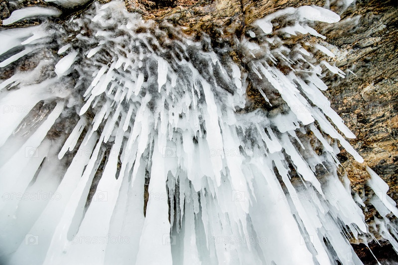 Ледяные сосульки, висящие на каменной поверхности пещеры, замерзшая вода зимой