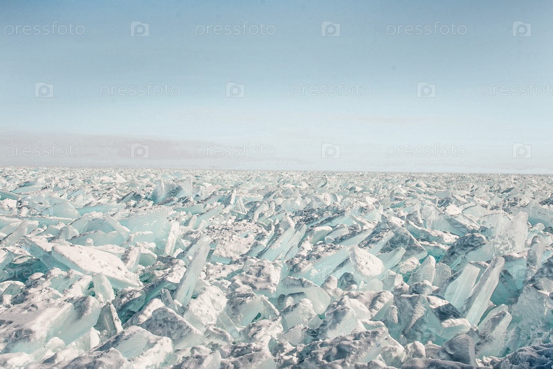 Ледяные торосы на поверхности замерзшего озера зимой, текстура льда и снега