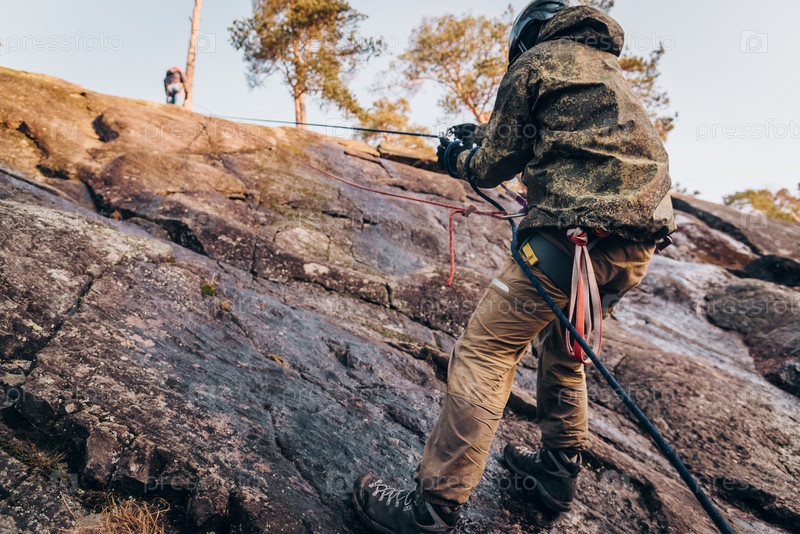 Скалолаз, восхождение на высокую скальную стену, экстремальные виды спорта на открытом воздухе, альпинистское снаряжение