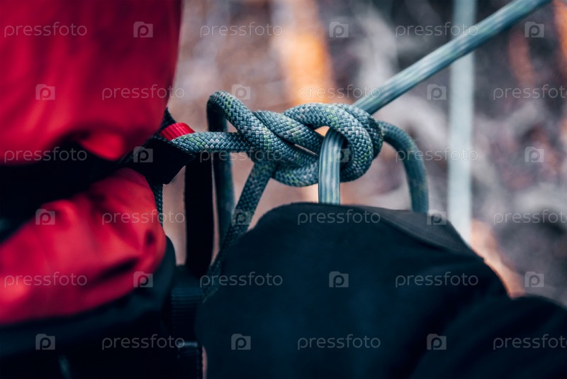 Скалолаз завязывает узел на веревке для альпиниста, готовящего альпинистское снаряжение