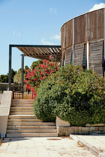Входная зона в здание кафе, кофейня в туристическом городе летом, ресторан с террасой