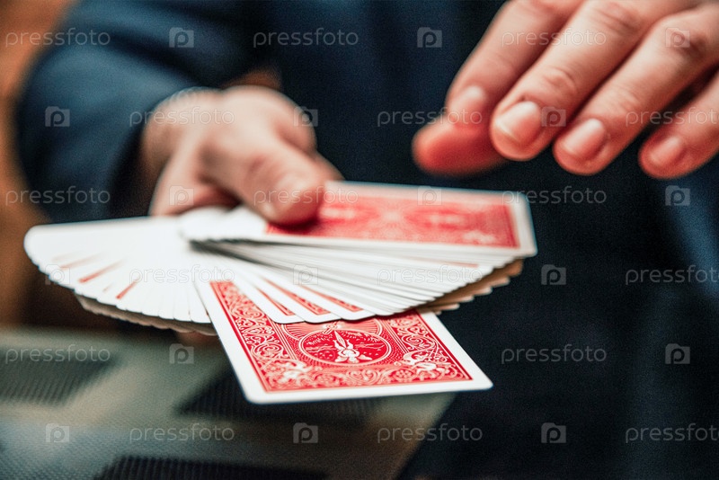 Фокусник показывает карточный фокус, мужчина играет в казино, крупный план рук, держащих колоду карт