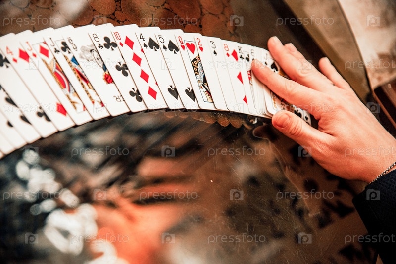 Фокусник показывает карточный фокус, мужчина играет в казино, крупный план рук, держащих колоду карт