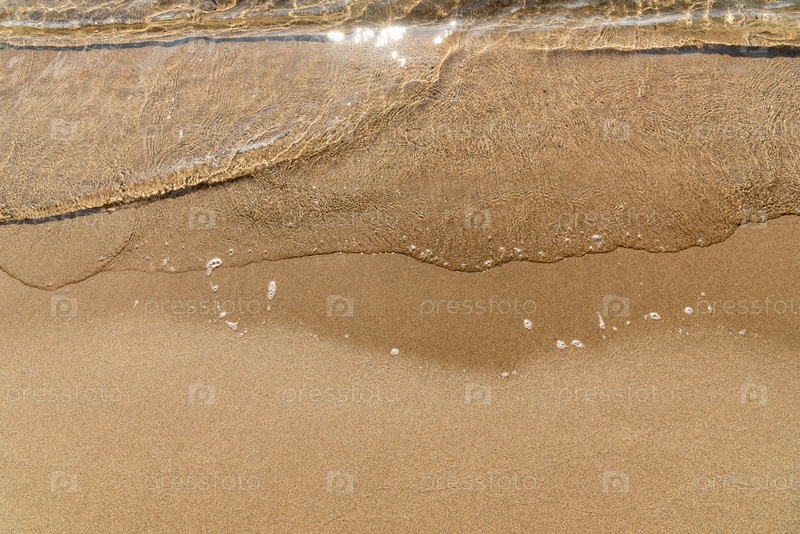 Песчаный желтый пляж на фоне моря, волны океана на песке