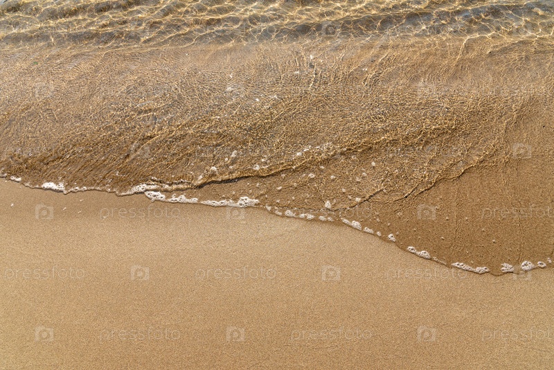 Песчаный желтый пляж на фоне моря, волны океана на песке