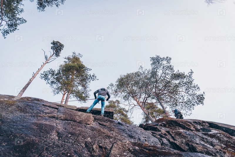 Скалолаз, восхождение на высокую скальную стену, экстремальные виды спорта на открытом воздухе, альпинистское снаряжение
