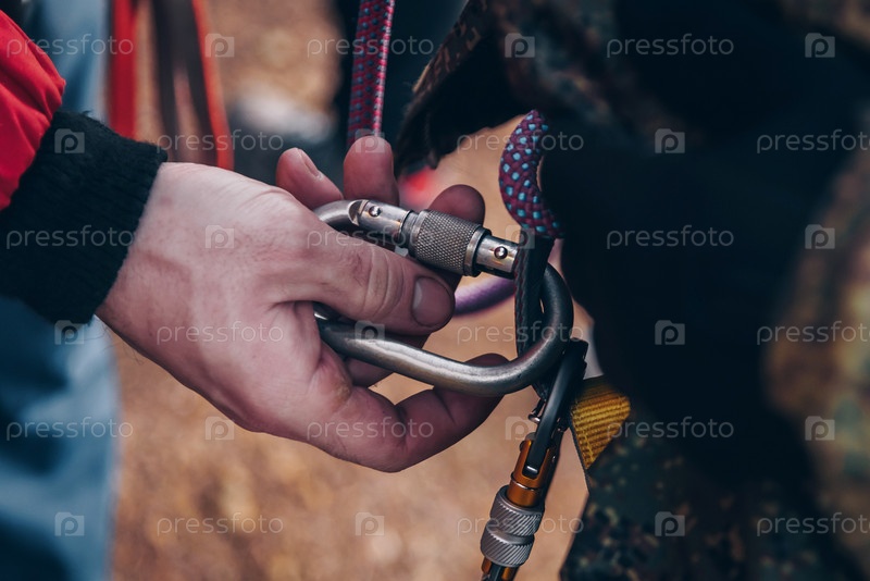 Скалолаз завязывает узел на веревке для альпиниста, готовящего альпинистское снаряжение