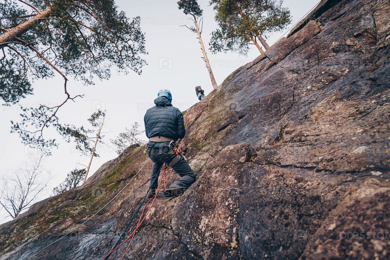 Скалолаз, восхождение на высокую скальную стену, экстремальные виды спорта на открытом воздухе, альпинистское снаряжение