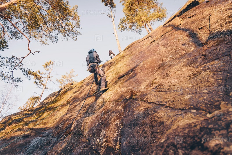 Скалолаз, восхождение на высокую скальную стену, экстремальные виды спорта на открытом воздухе, альпинистское снаряжение