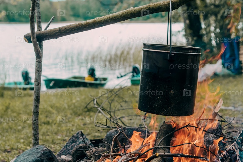 Походная кухня, путешественники готовят еду в горшках на костре