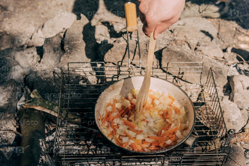 Походная кухня, путешественники готовят еду в горшках на костре