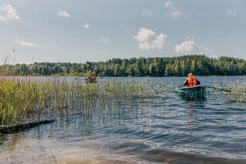 Лодки пришвартованы на берегу озера, путешествуют по воде реки на надувной лодке