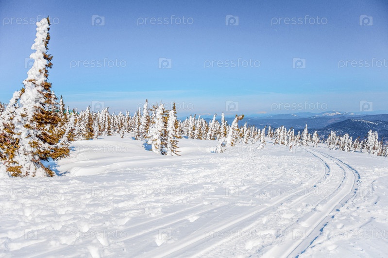 Белый зимний лесной пейзаж, заснеженные деревья и облачное небо, яркий день