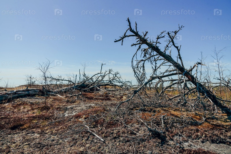Пустынный пейзаж сгоревшего леса, сухие деревья без листьев на фоне голубого неба и сухой травы