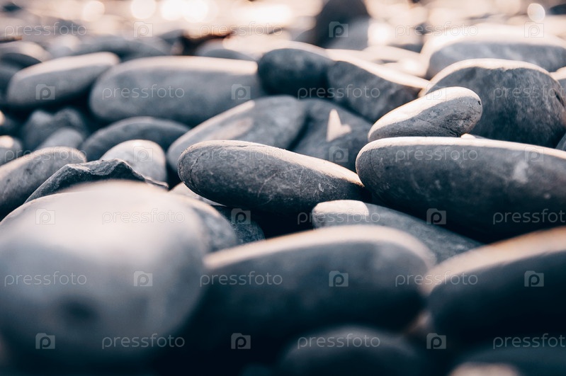 Галечный пляж на фоне моря, туманный летний день
