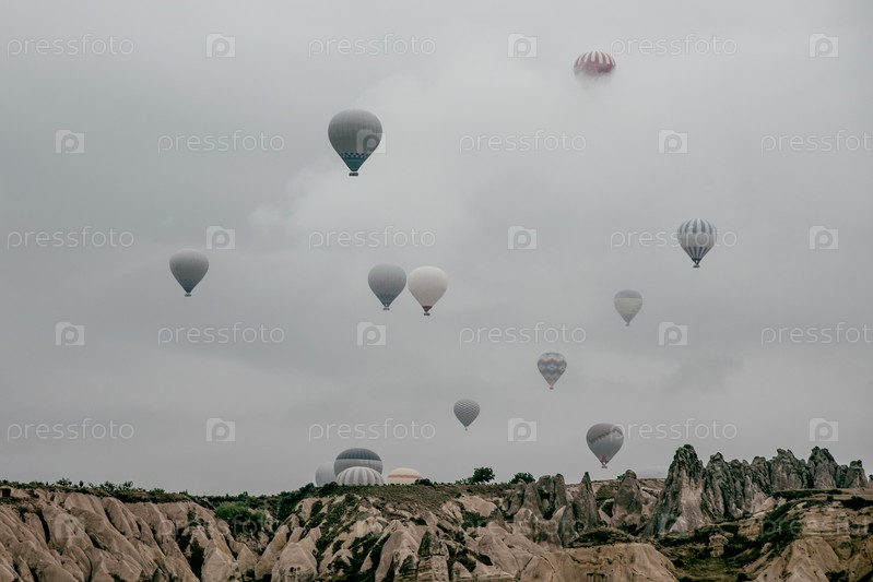 Полет на воздушном шаре рано утром на рассвете в облачном небе, на фоне горы и скалы