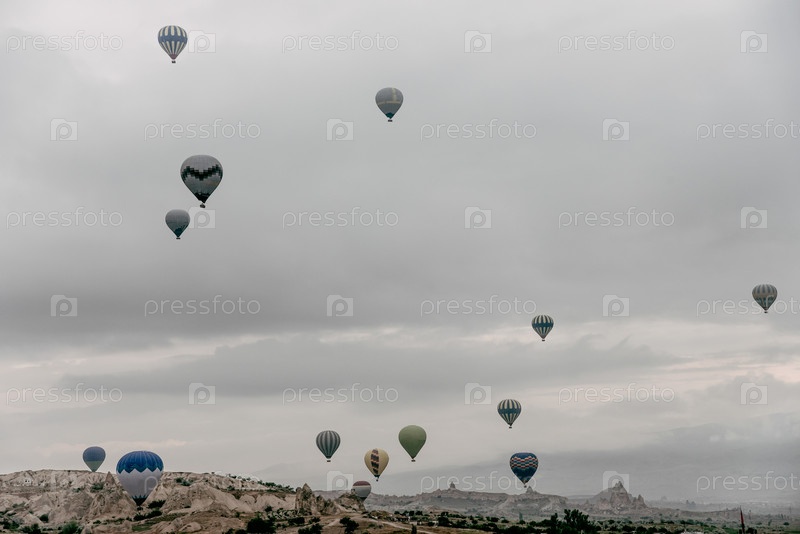Полет на воздушном шаре рано утром на рассвете в облачном небе, на фоне горы и скалы