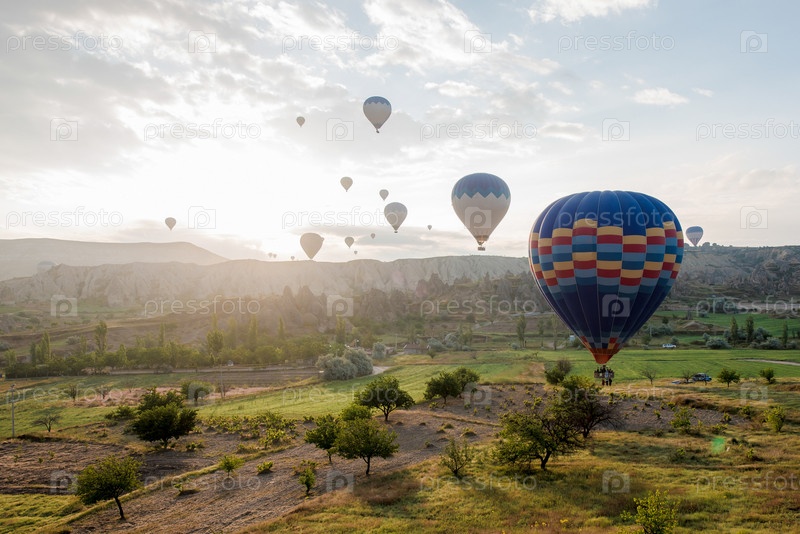 Полет на воздушном шаре рано утром на рассвете в облачном небе, на фоне горы и скалы