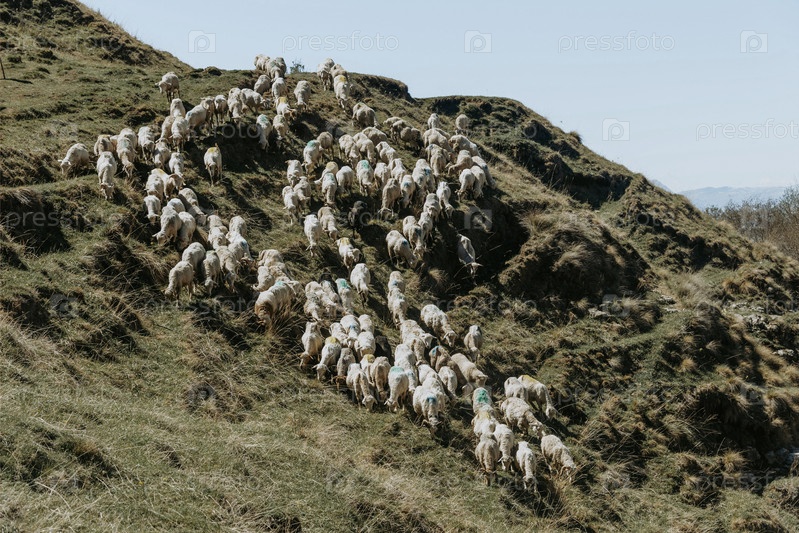 Стадо горных овец пасется на холмистом зеленом лугу, сельскохозяйственные животные гуляют