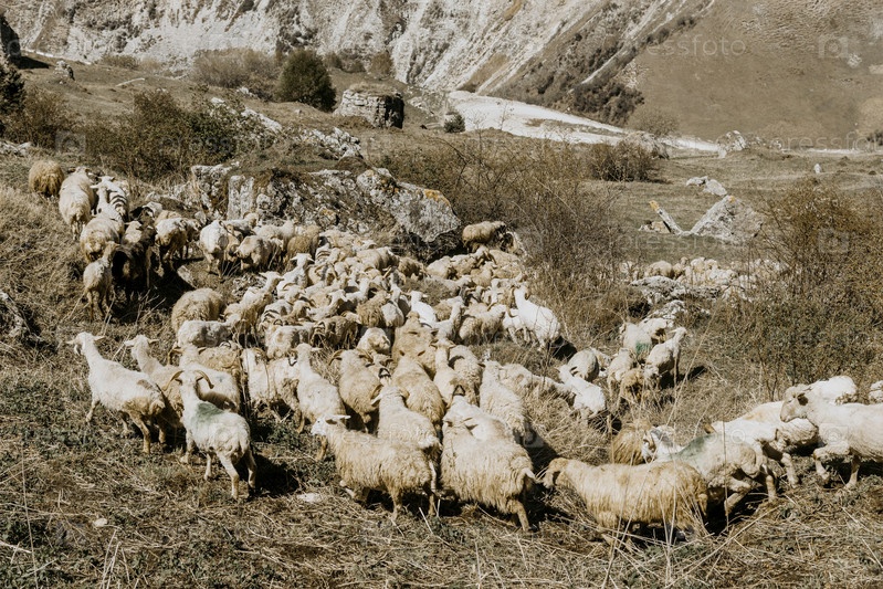 Стадо горных овец пасется на холмистом зеленом лугу, сельскохозяйственные животные гуляют