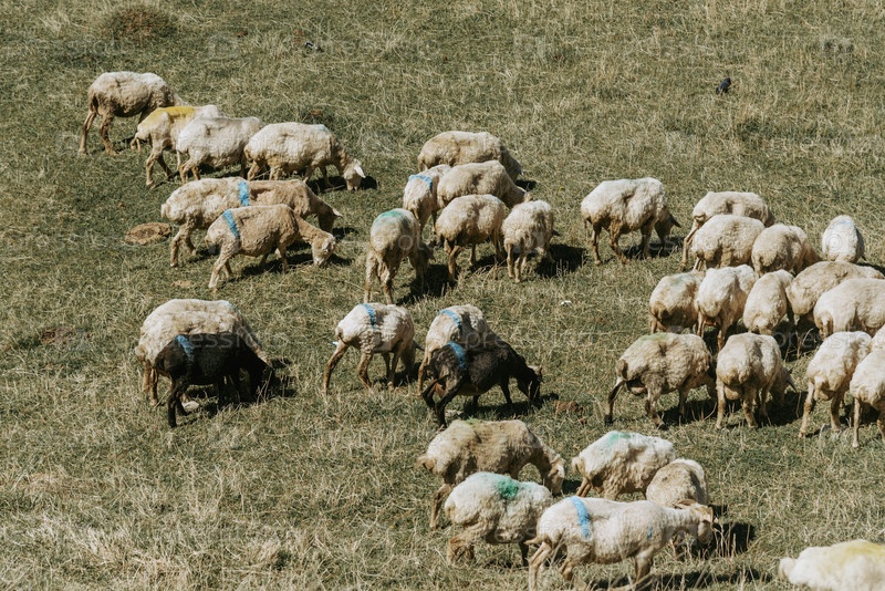 Стадо горных овец пасется на холмистом зеленом лугу, сельскохозяйственные животные гуляют