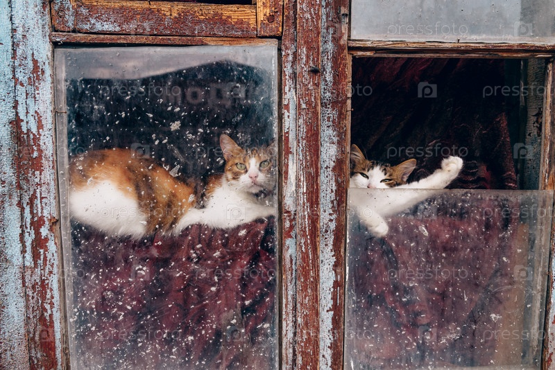 Милые пушистые коты лежат на занавеске за оконным стеклом, питомец отдыхает, деревенский котенок