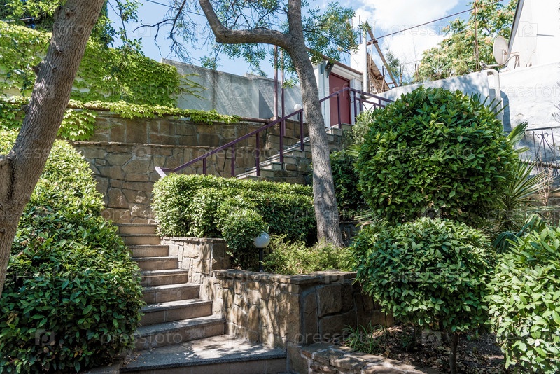 Бетонная лестница в городском парке, лестница на фоне зеленой травы летним днем