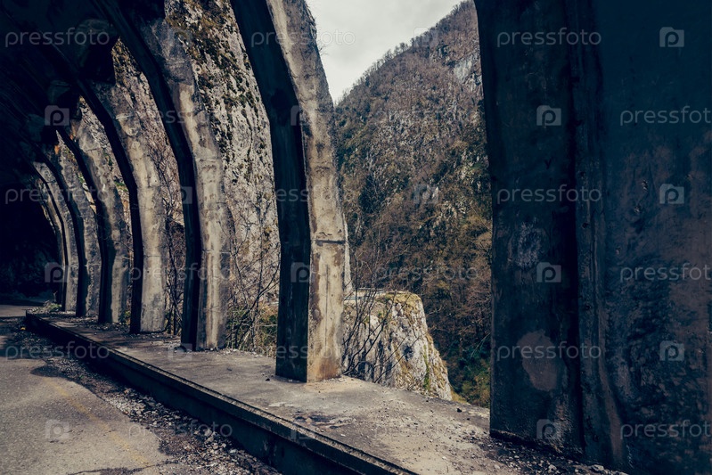 Старый туннель, высеченный в скалистой горе для шоссе, длинный коридор арок