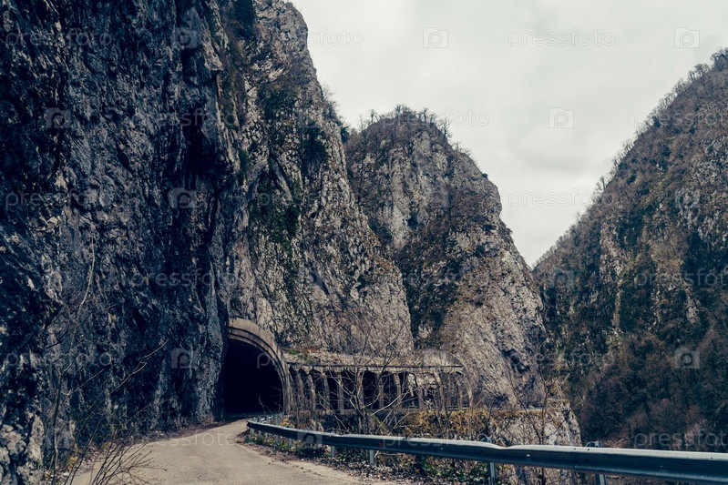 Старый туннель, высеченный в скалистой горе для шоссе, длинный коридор арок