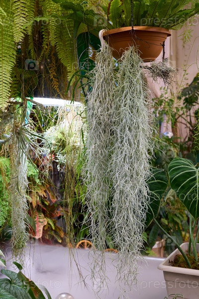 Пышный и красивый свисающий испанский мох в тихом и спокойном крытом садовом пространстве