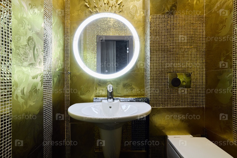 Эта ванная комната с золотым декором отличается современными штрихами, которые подчеркивают ее стиль и комфорт
