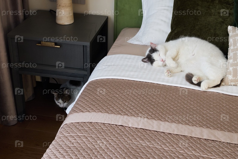 Представьте себе очаровательную сцену в помещении, где кошки спокойно расположились на уютной кровати