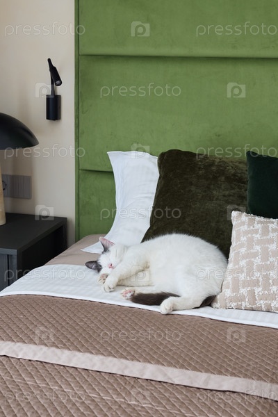 Уютная спальня с очаровательной кошкой, удобно расположившейся на мягкой кровати с подушками