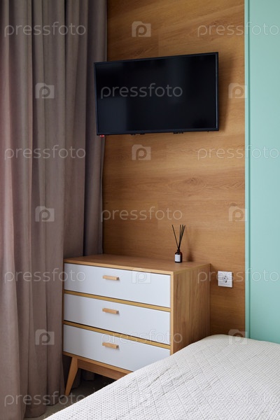 Современная спальня с настенным телевизором и стильной, шикарной мебелью