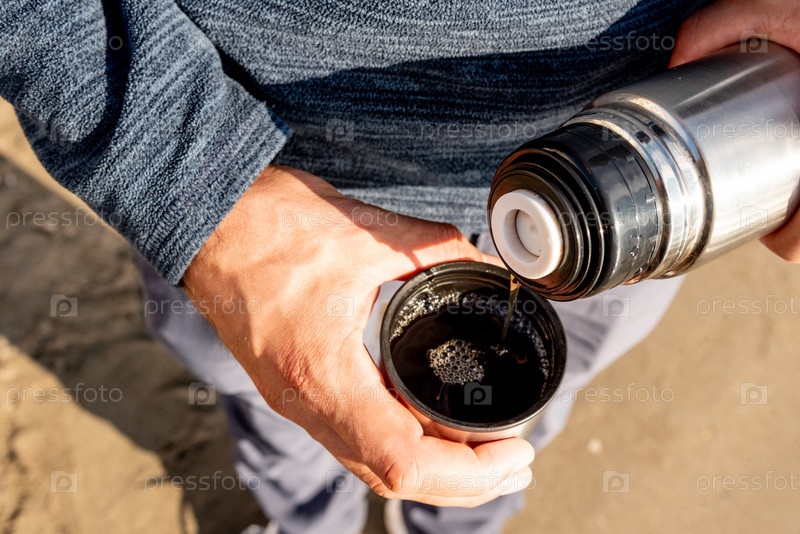 Мужчина-путешественник наливает чай в кружку из металлического термоса, человек стоит на песчаном пляже