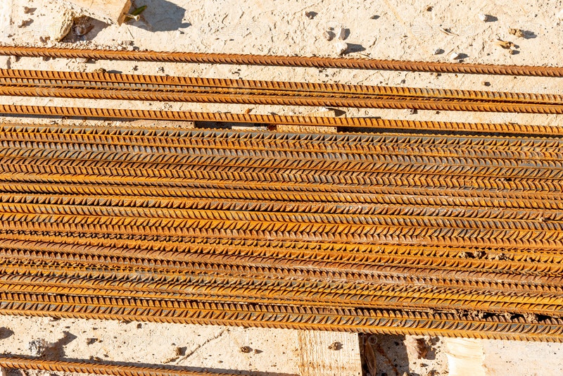 Металлическая арматура лежит на строительной площадке, постройте здание с арматурой