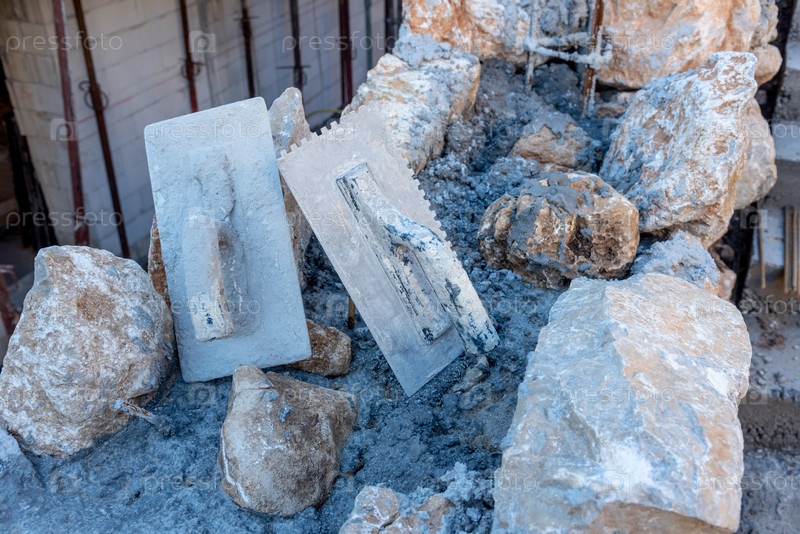 Строительство наружной стены из камня и бетона, строительные инструменты, штукатурка ложится на поверхность