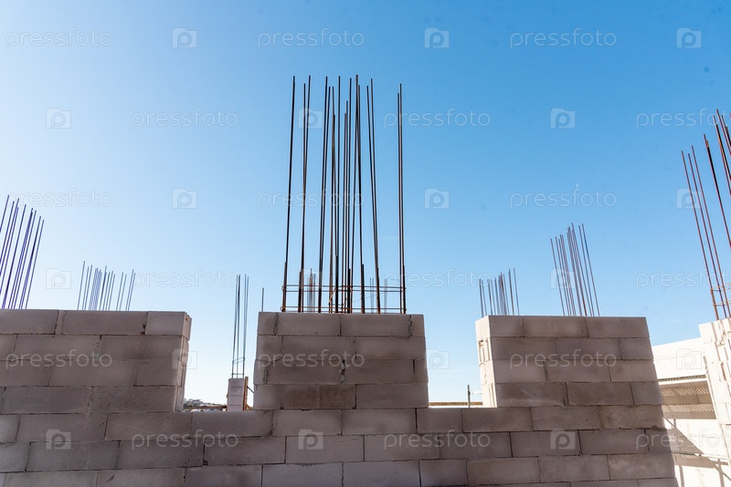 Открытая строительная площадка, строительство жилого дома, металлическая арматура и бетонные конструкции