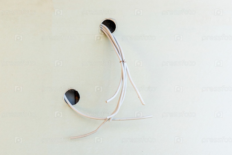 Ремонт квартиры, провод торчит из отверстия для розетки в гипсокартонной стене, разводка электроцепи