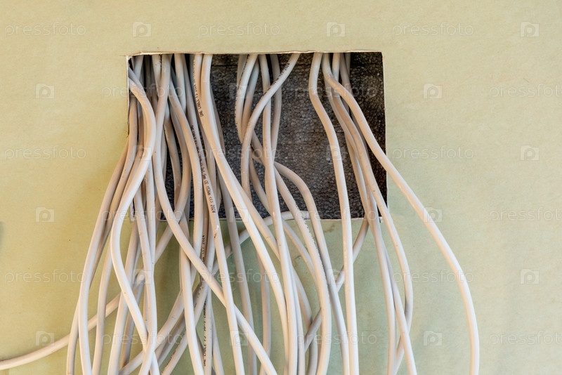 Ремонт квартиры, провод торчит из отверстия для розетки в гипсокартонной стене, разводка электроцепи