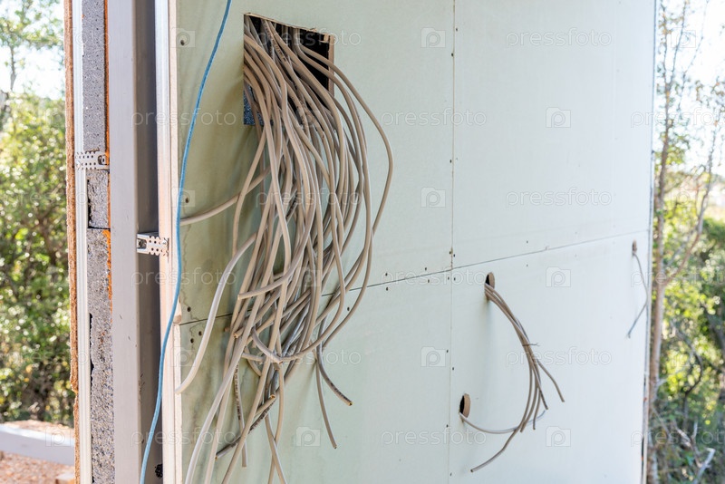 Ремонт квартиры, провод торчит из отверстия для розетки в гипсокартонной стене, разводка электроцепи